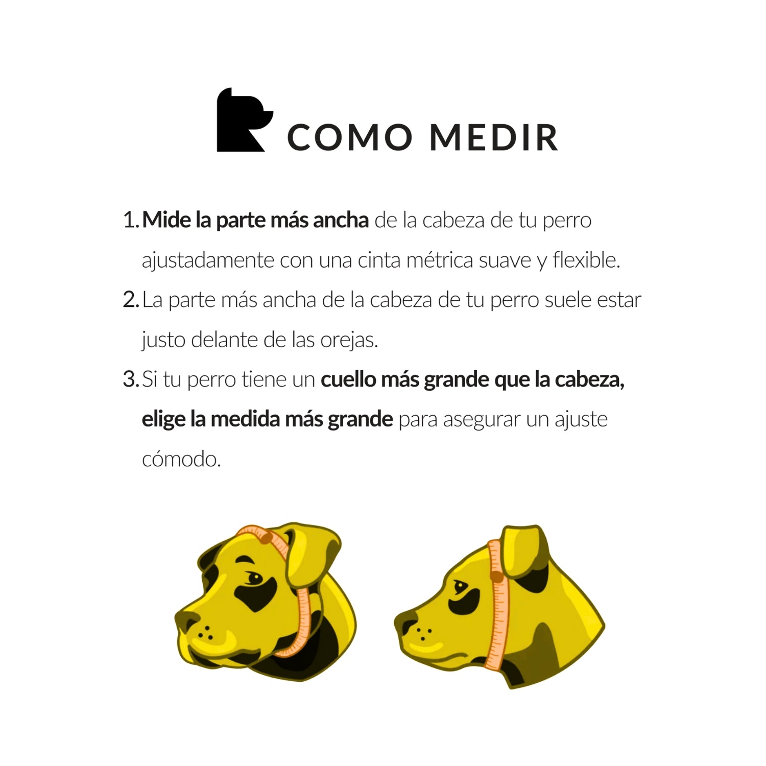 - Mide la parte más ancha de la cabeza/cuello de tu perro antes de elegir la talla (las instrucciones están después de las fotos del producto).